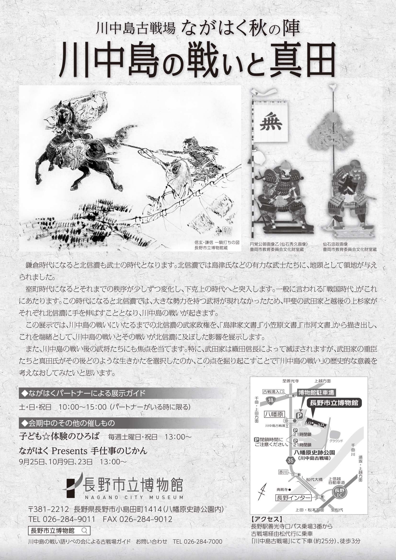 この展示では、川中島の戦いにいたるまでの北信濃の武家政権を、「島津家文章」「小笠原家文書」「市川文書」から描き出し、これを端緒として、川中島の戦いとその戦いが北信濃に及ぼした影響を展示します。