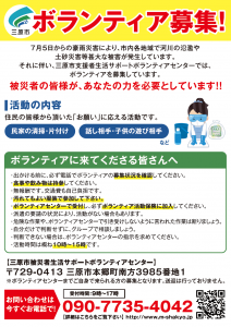 三原市災害ボランティアセンターでは,現在,被災地を支援する活動をしていただく災害ボランティアを募集しています。