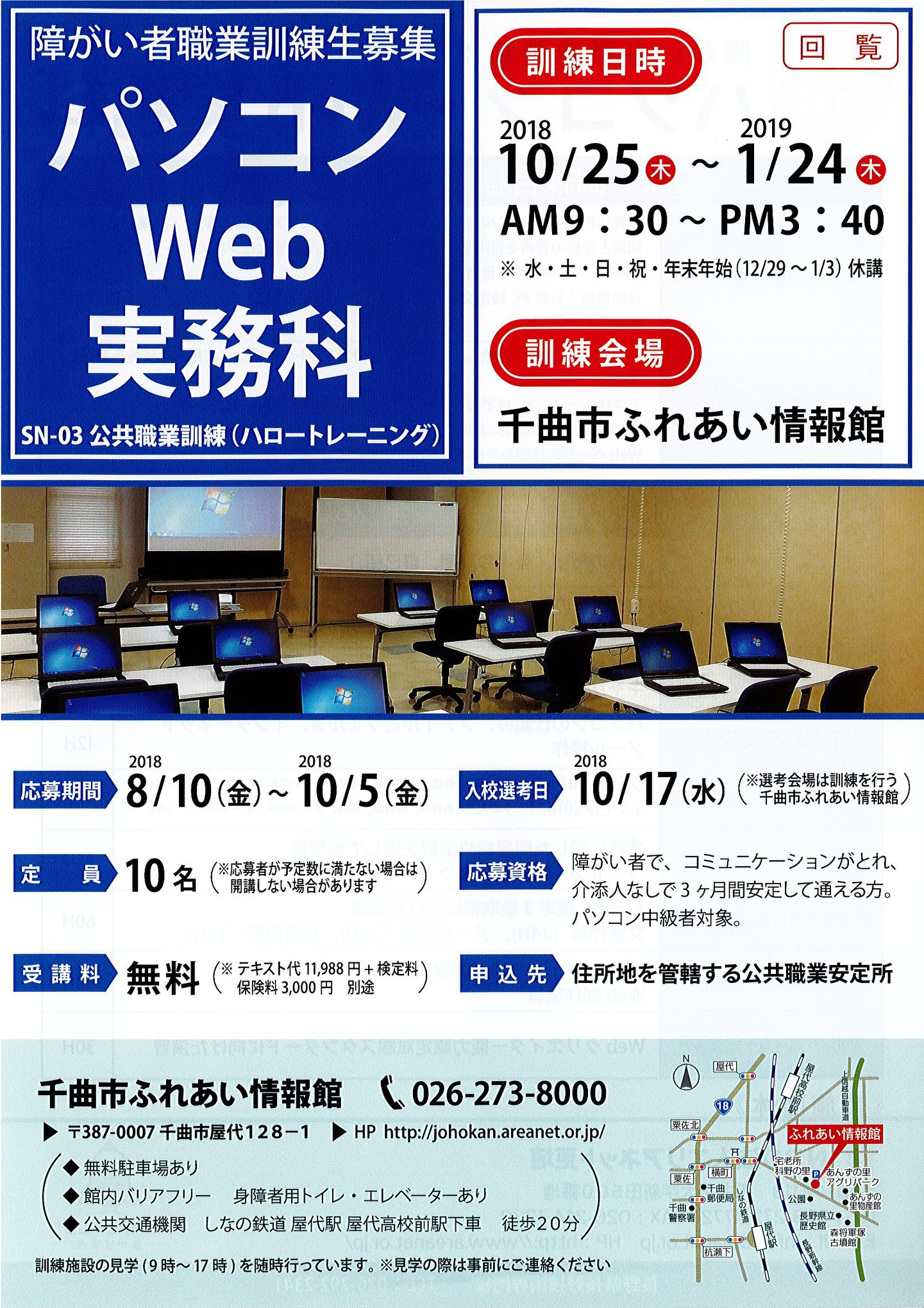 千曲市ふれあい情報館にて、障がい者向けのパソコン教室を開催します。訓練科目など詳細はポスターをご覧ください。