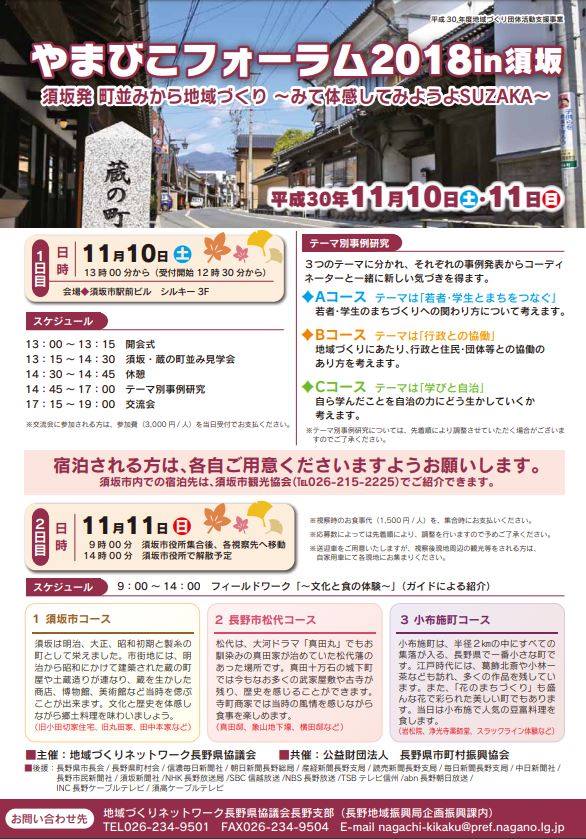 県内各地の地域づくり団体や自治体関係者が集い、地域づくり活動への理解を深めるとともに団体相互の交流を推進する「やまびこフォーラム2018㏌須坂」の参加者を募集しています。