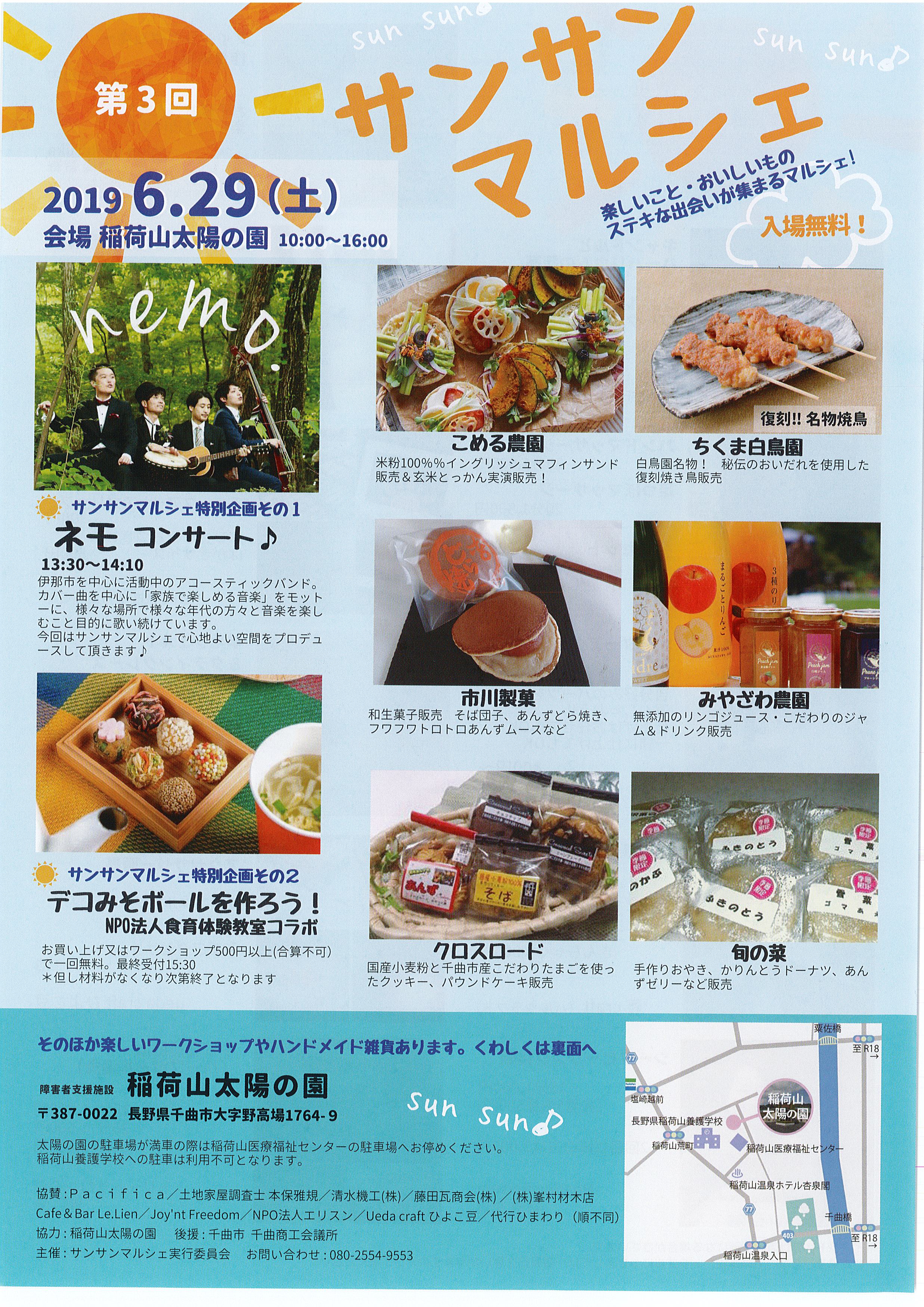 第3回サンサンマルシェ開催! 2019年5月17日カテゴリー: 市民活動・イベント情報 楽しいこと・おいしいものすてきな出会いが集まるマルシェ!! 特別企画その2:デコみそボールを作ろう!NPO法人食育体験教室コラボ 他にも楽しいワークショップやハンドメイド雑貨などもりだくさん。 ■日時 6月29日(土)10:00~16:00 ■場所 障害者支援施設 稲荷山太陽の園 ■主催・問い合わせ サンサンマルシェ実行委員会 ℡:080-2554-9553 このページをシェアする クリックして友達にメールでリンクを送信 (新しいウィンドウで開きます) メールアドレス クリックして印刷 (新しいウィンドウで開きます) 印刷 Tweet こちらもあわせてチェック 前の記事2019まちの縁側 縁奏会にようこそ。次の記事多文化キッチン はたけプロジェクト☆