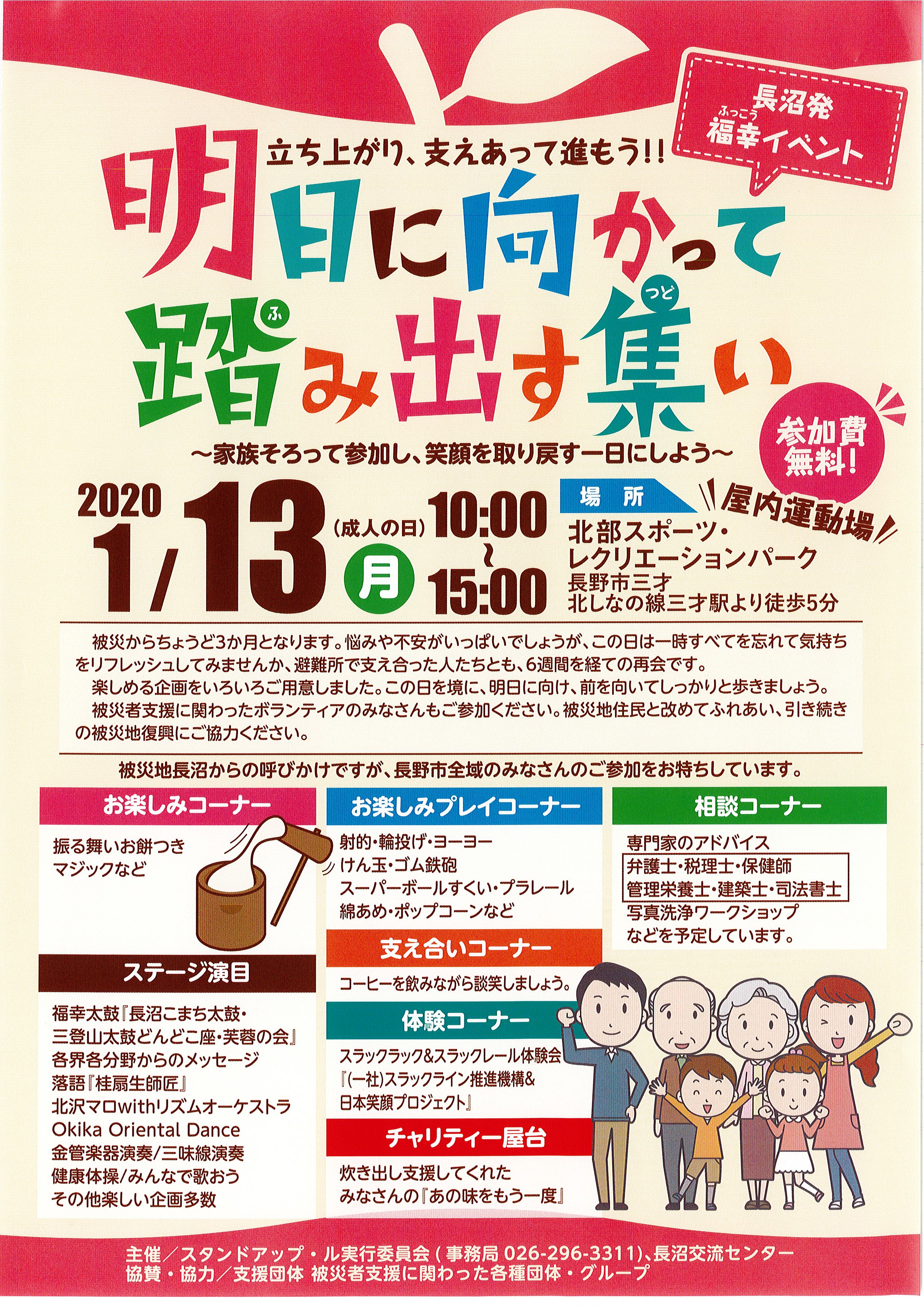 明日に向かって踏み出す集い【長沼発福幸イベント】 2020年1月11日カテゴリー: 市民活動・イベント情報 明日に向かって踏み出す集い【長沼発福幸イベント】 被災から三カ月。楽しいイベントに参加し、みんなで笑顔で明日に向け前を向いて歩いていきましょう! お餅つきなどの楽しいイベントのほかに、専門家による相談コーナーもあります。 ぜひお出かけください。 ■日時:1月13日(月)10:00~15:00 ■場所:北部スポーツ・レクリエーションパーク屋内運動場 ■参加費:無料 このページをシェアする クリックして友達にメールでリンクを送信 (新しいウィンドウで開きます) メールアドレス クリックして印刷 (新しいウィンドウで開きます) 印刷 Tweet こちらもあわせてチェック 前の記事100の大岡次の記事北陸知己の活性化に関する研究助成事業 第25回 助成事業募集