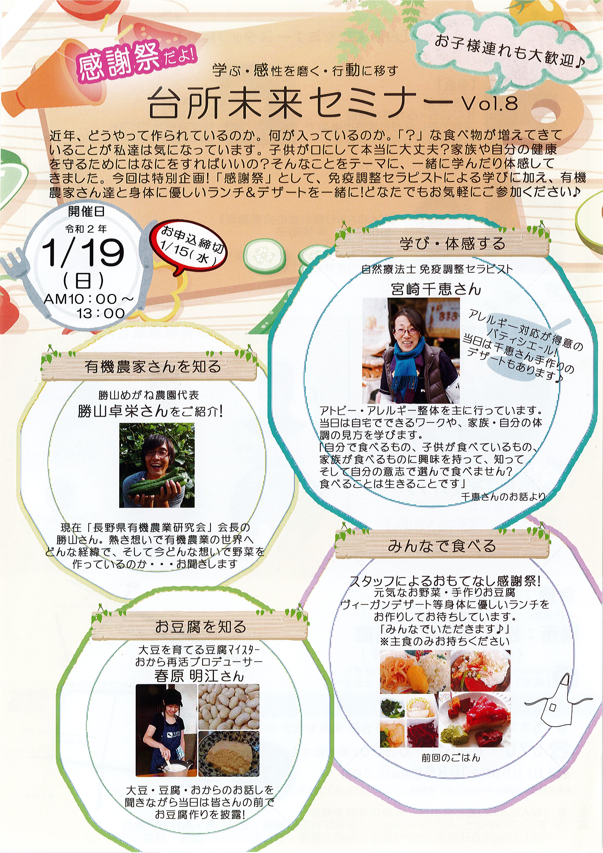 1月19日(日)10時より、スタッフが真心込めて作るお料理を頂く感謝祭を開催します。