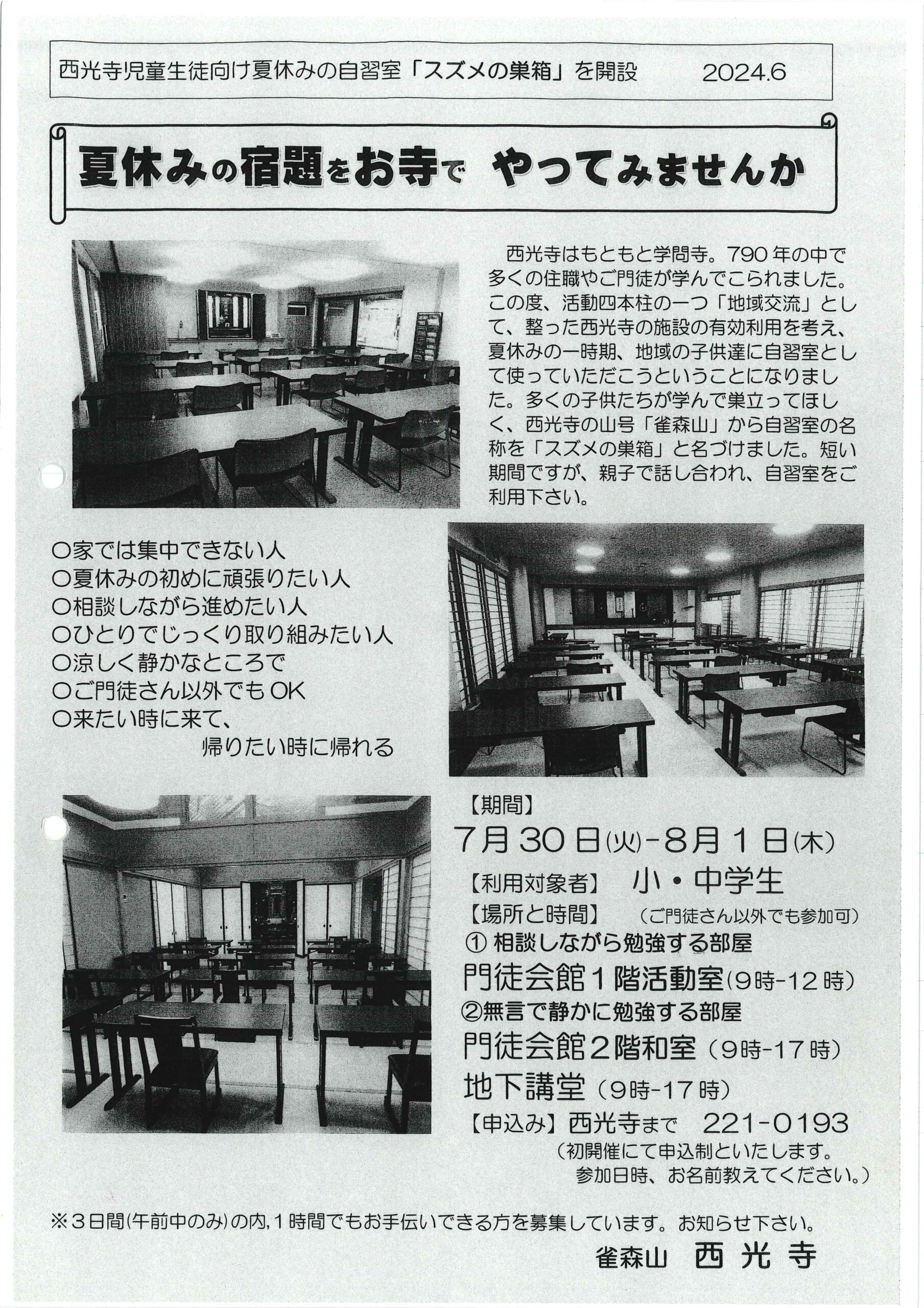 家では集中できない人、夏休みの初めに頑張りたい人などの子どもたち向けに、雀森山 西光寺(長野市高田1992)にて、「スズメの巣箱」自習室を開設しています!ご門徒さん以外でも大丈夫。