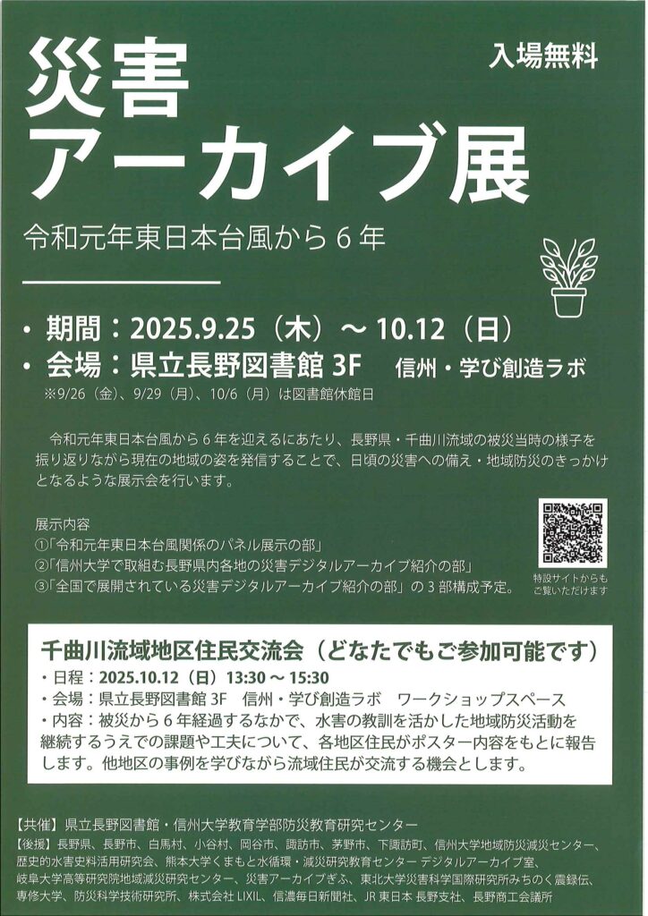 令和元年東日本台風から6年を迎えるにあたり、長野県・千曲川流域の被災当時の様子を振り返りながら現在の地域の姿を発信することで、日頃の災害への備え・地域防災のきっかけとなるような展示会を行います。