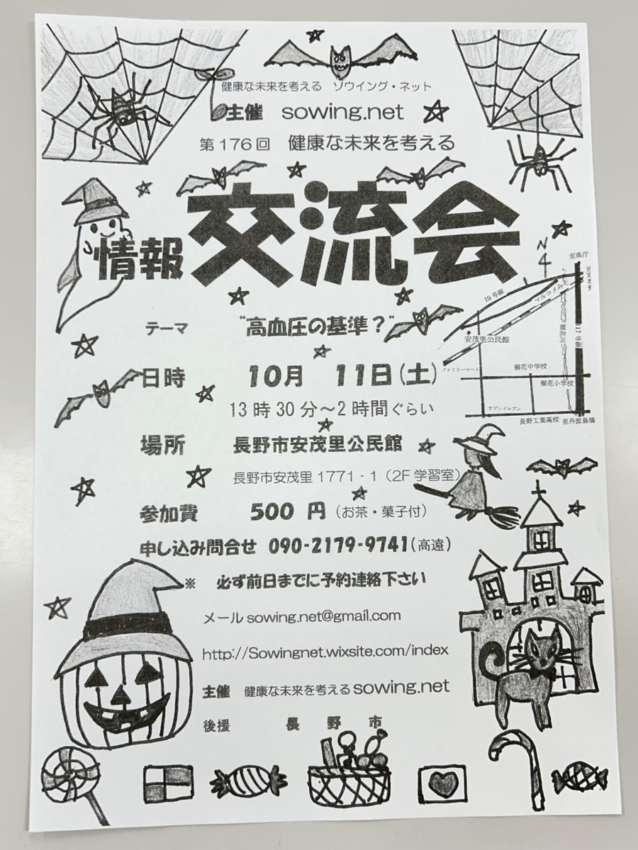 【sowing net主催】第176回健康な未来を考える情報交流会 2025年9月29日カテゴリー: 講座 ◆日時:2025年10月11日(土)13:30~2時間ぐらい◆会場:長野市安茂里公民館◆テーマ:高血圧の基準?◆参加費:500円(お茶・菓子付き)◆申込方法:開催前日までに下記の電話番号までお申し込みください。 ◆申し込み・お問い合わせ 健康な未来を考える sowing.net090-2179-9741(高遠) #情報 #NPO #長野市 #市民活動 #健康 #イベント情報 このページをシェアするメールアドレス印刷Tweet こちらもあわせてチェック 前の記事【まんまる 主催】「機関誌」発送サロンのお知らせ次の記事【助成金情報】シンボリキミエ基金