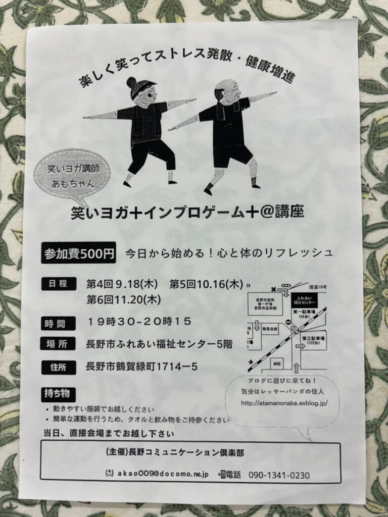 【長野コミュニケーション倶楽部主催】笑いヨガ+インプロゲーム+@講座 2025年10月12日カテゴリー: イベント・交流会 今日から始める!心と体のリフレッシュ。楽しく笑ってストレス発散・健康増進。動きやすい服装で。 ◆日時:10月16日(木)・11月20日(木)19:30~20:15◆会場:長野市ふれあい福祉センター5階◆講師:笑いヨガ講師あもちゃん◆参加費:500円◆持ち物:タオル、飲み物 ◆お問い合わせ 長野コミュニケーション倶楽部 TEL090-1341-0230 メールakao009@docomo.ne.jp #情報 #NPO #長野市 #市民活動 #笑いヨガ #ストレス発散 このページをシェアするメールアドレス印刷Tweet こちらもあわせてチェック 前の記事【開催レポート】折紙体験(おりがみたいけん)次の記事【信級きぼうの森ほか主催】森に学び森と生きる 長者山森林体験交流会