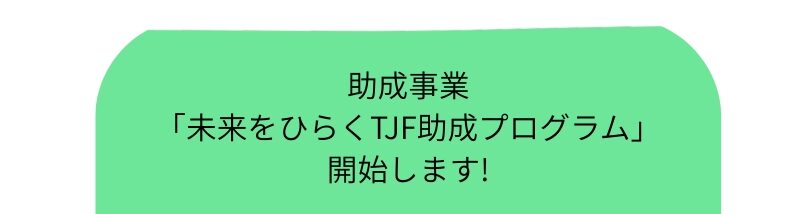 この度、事業目標を更に広く達成するため、TJFのビジョン・ミッションと親和性の高い他団体に助成する助成事業「未来をひらくTJF助成プログラム」を開始します。助成事業によってTJFは直接かつ間接的に公益の増進に役立つ事業を推進していきます。