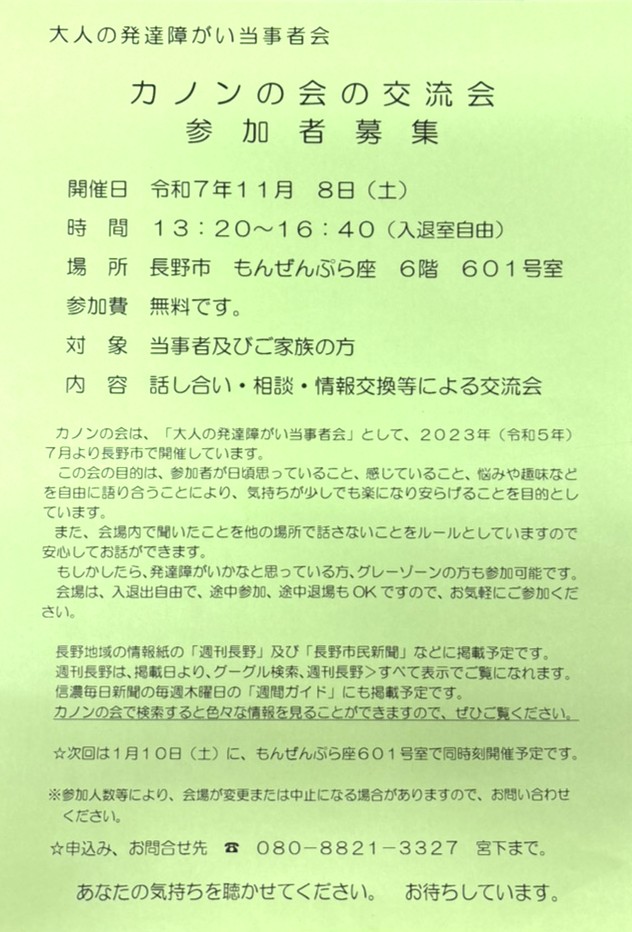 【大人の発達障がい当事者の会 カノンの会主催】カノンの会の交流会 2025年10月16日カテゴリー: イベント・交流会 ◆日時:2025年11月8日(土) 13:20~16:40(入退室自由)◆会場:もんぜんぷら座 6階 601号室◆対象:当事者及びご家族の方※参加人数等により、会場が変更または中止になる場合がありますので、お問い合わせください。◆参加費:無料◆申込方法:電話にてお申込みください ◆お問い合わせ カノンの会 (宮下) TEL:080-8821-3327 #情報 #NPO #長野市 #市民活動 #大人の発達障がい #交流会 このページをシェアするメールアドレス印刷Tweet こちらもあわせてチェック 前の記事【助成金情報】エフピコ環境基金次の記事【清泉大学・清泉大学短期大学部地域連帯センター主催】2025年度生涯学習特別講座 1人でも多すぎる~性暴力を許さず、明るい未来へ~