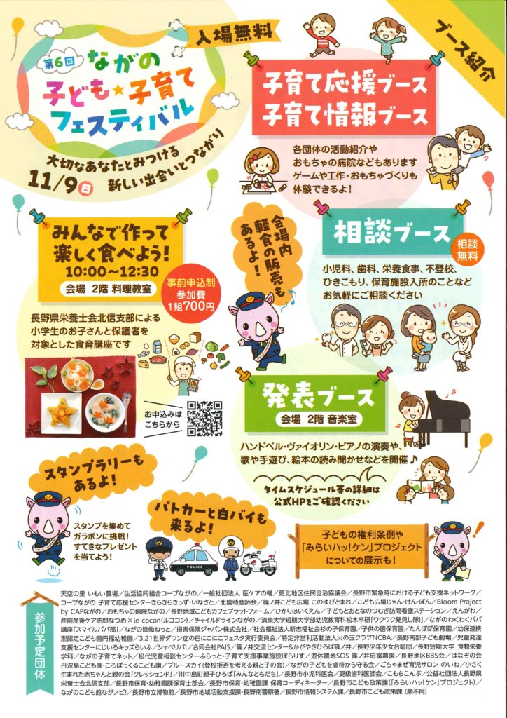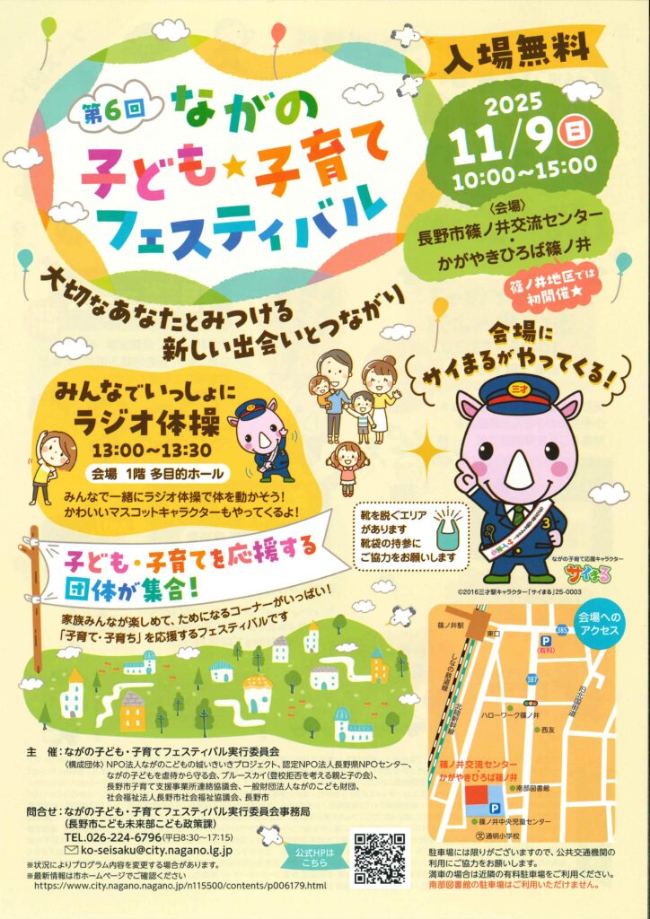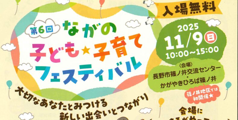 【ながの子ども・子育てフェスティバル実行委員会主催】第6回ながの子ども☆子育てフェスティバル 2025年10月21日カテゴリー: イベント・交流会 ◆日時:2025年11月9日(日)10:00~15:00◆会場:篠ノ井交流センター・かがやきひろば篠ノ井(長野市篠ノ井御幣川281-1)◆参加費:入場無料 ◆お問い合わせ こども未来部こども政策課長野市大字鶴賀緑町1613番地第二庁舎2階TEL:026-224-6796FAX:026-224-7648 #情報 #NPO #長野市 #市民活動 #子育て応援 #子どもの権利条例 #食育講座 #サイまる このページをシェアするメールアドレス印刷Tweet こちらもあわせてチェック 前の記事【市民活動レポート】中条地区住民自治協議会活性化ワークショップ