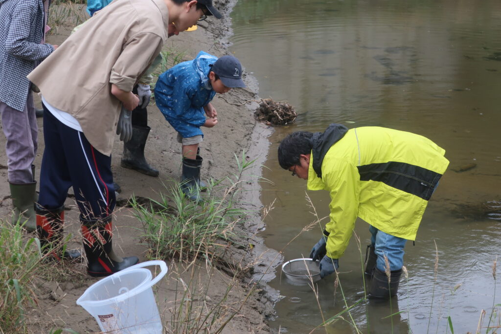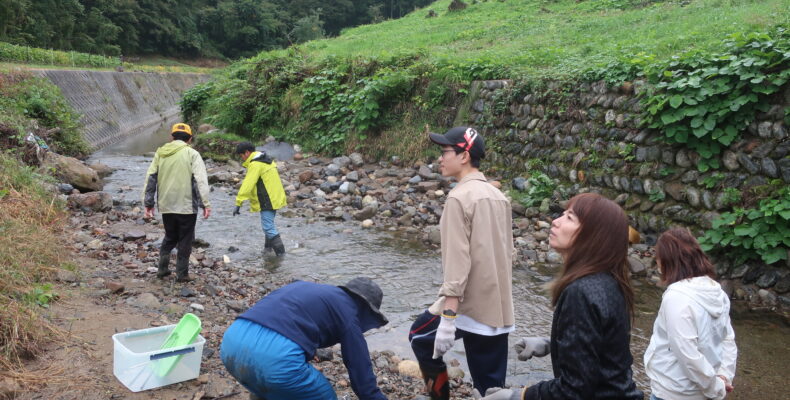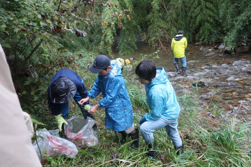 実際に村内を流れる川へ行き、川岸にある草の根元の泥をすくって虫眼鏡で観察したり、目で見えるごみを拾いました。