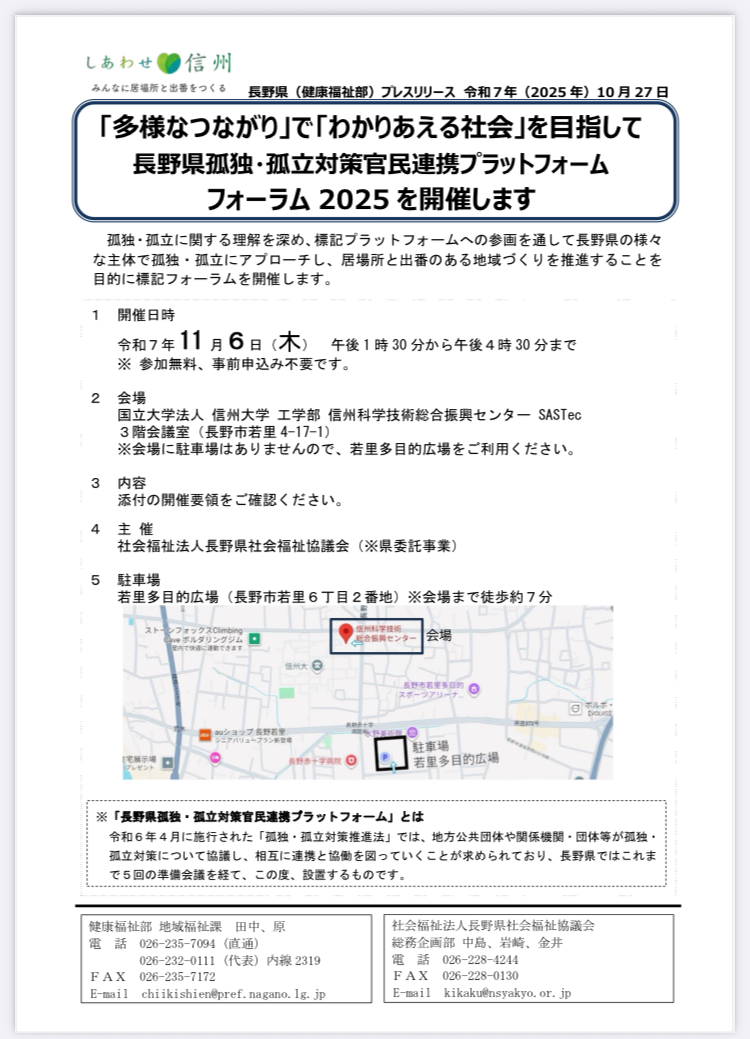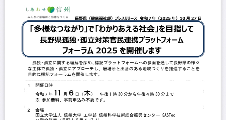 孤独・孤立に関する理解を深め、プラットフォームへの参画を通して長野県の様々な主体で孤独・孤立にアプローチし、居場所と出番のある地域づくりを推進することを目的に標記フォーラムを開催します。