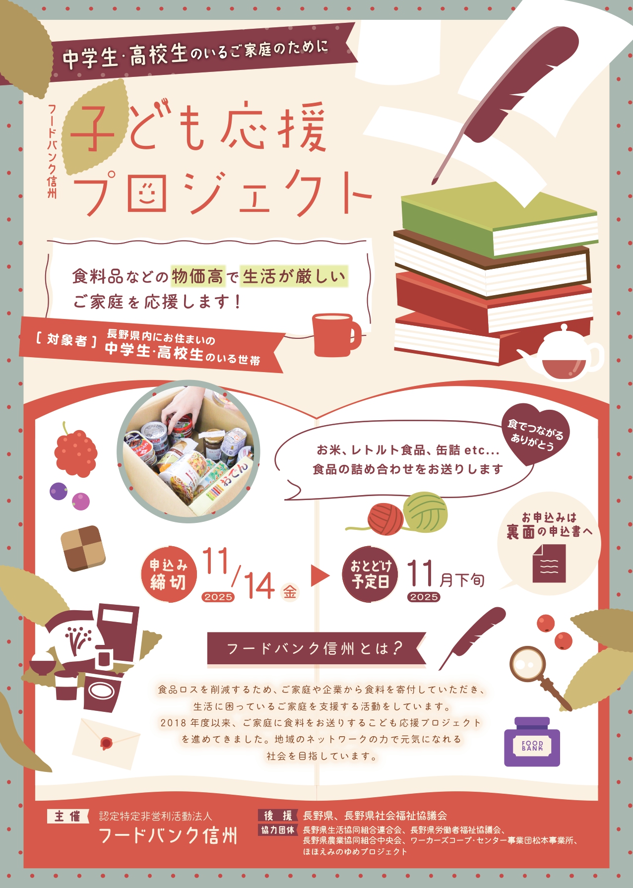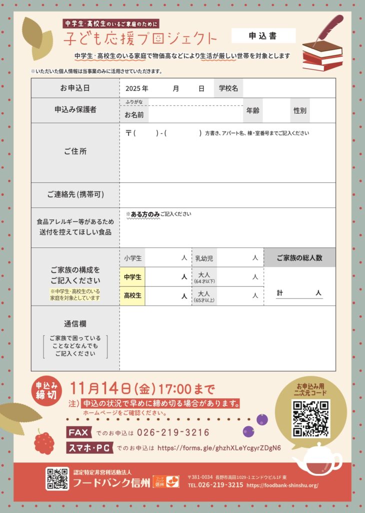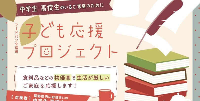 フードバンク信州では、食料品などの物価高で生活が厳しいご家庭を食料で応援する“中学生・高校生のいるご家庭のために”「子ども応援プロジェクト」を実施します。
