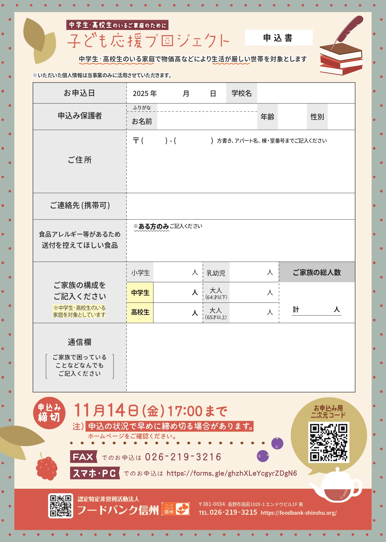 長野県内に居住されており中学生・高校生がいる生活が厳しいご家庭で、食料提供を希望される方は別添申込書でお申し込みください。