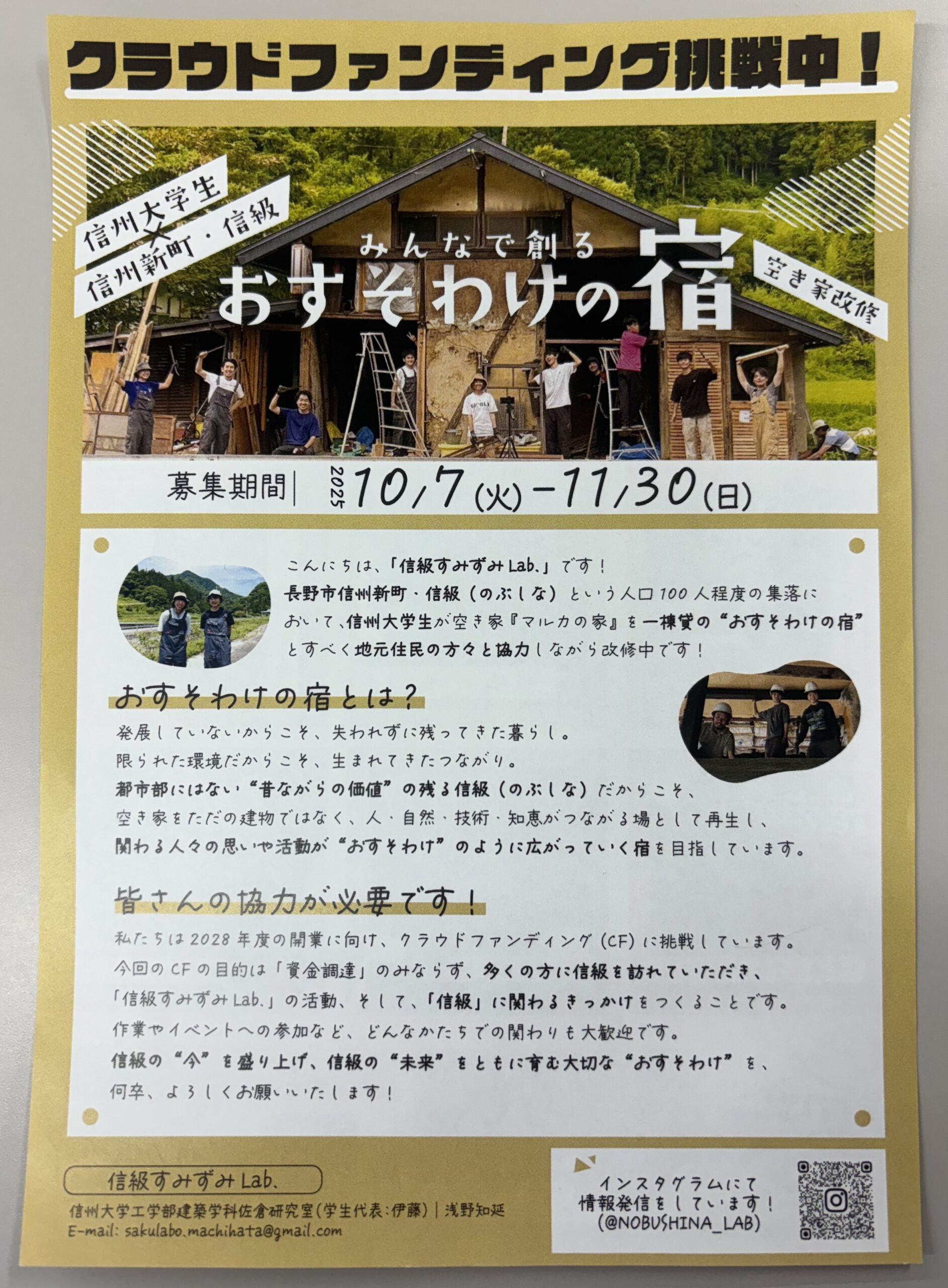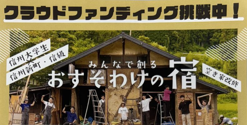 長野市信州新町・信級という人口100人「程度の集落において、信州大学生が空き家「マルカの家」を一棟貸の“おすそわけの宿”とすべく地元住民の方々と協力しながら改修中、クラウドファンディングに挑戦中です!