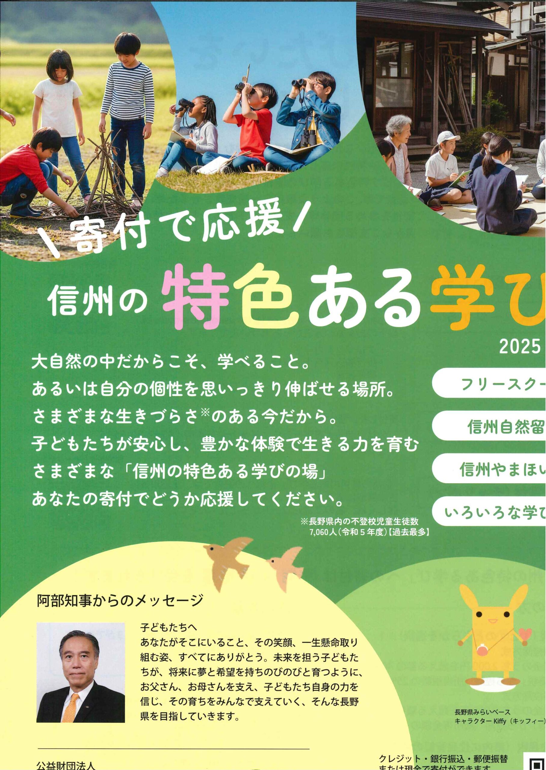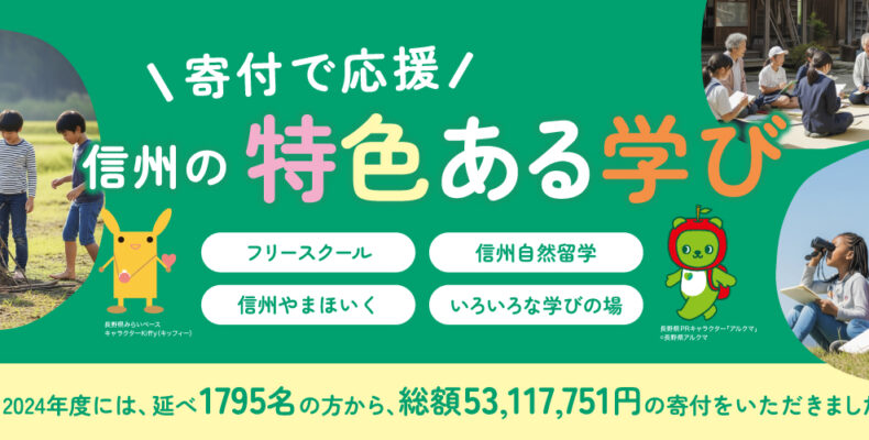 長野県みらい基金と長野県では、このような取り組みを一層充実させるため、寄附募集サイト「長野県みらいベース」において寄付を集め、こういった「信州の特色ある学び」への支援を行い、子どもたちが主体的に学び続けられる環境づくりを進めます。