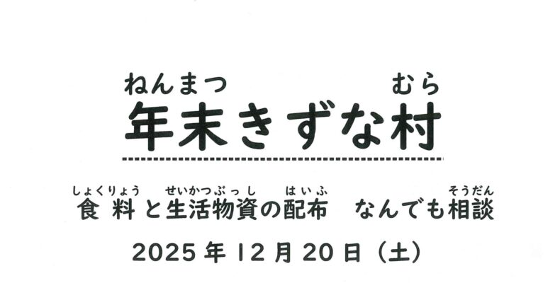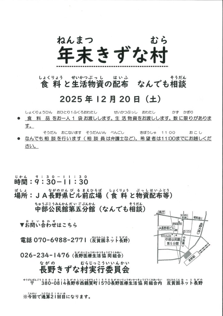 【長野きずな村実行委員会主催】第21回年末きずな村 食料と生活物資の配布、なんでも相談 2025年11月27日カテゴリー: 市民活動情報 食料品・生活物資を配布します。一人一袋。数に限りあり。なんでも相談の希望者は11:00までに来場ください。 ◆日時:12月20日(土)9:30~11:30◆会場:JA長野県ビル前広場、なんでも相談は中部公民館第五分館 ◆お申し込み・お問い合わせ 長野きずな村実行委員会 TEL:070-6988-2771(反貧困ネット長野) 026-234-1476(長野医療生活協同組合) #情報 #NPO #長野市 #市民活動 #生活物資配布 #食料配布 #相談 このページをシェアする クリックして友達にメールでリンクを送信 (新しいウィンドウで開きます) メールアドレス クリックして印刷 (新しいウィンドウで開きます) 印刷 Tweet こちらもあわせてチェック 前の記事【開催報告】まんまるボランティアサロンを開催しました!!