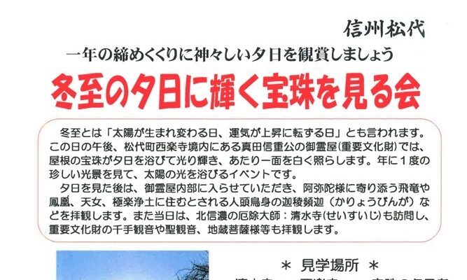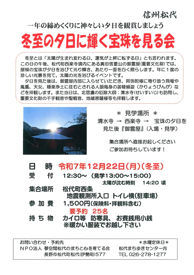 【NPO法人夢空間松代のまちと心を育てる会主催】冬至の夕日に輝く宝珠を見る会 2025年12月5日カテゴリー: イベント・交流会 一年の締めくくりに神々しい夕日を鑑賞しましょう!! ◆日時:2025年12月22日(月)13:00~(受付12:30~)◆集合場所:松代町西条 地震観測所入口 トイレ横の駐車場◆定員:25人◆参加費:1,500円◆持ち物:カイロ、防寒具、お賽銭用小銭。暖かい服装で。 ◆申し込み・お問い合わせ NPO法人夢空間松代のまちと心を育てる会 事務局定休日:水曜日TEL:026-278-1277 #情報 #NPO #長野市 #市民活動 #松代 #真田信重 このページをシェアする クリックして友達にメールでリンクを送信 (新しいウィンドウで開きます) メールアドレス クリックして印刷 (新しいウィンドウで開きます) 印刷 Tweet こちらもあわせてチェック 前の記事【大人の発達障がい当事者会カノンの会主催】第16回カノンの会&2026年間開催日程のお知らせ