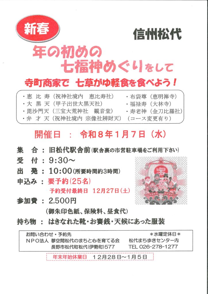 【NPO法人夢空間松代のまちと心を育てる会主催】年の初めの七福神めぐりをして寺町商家で七草がゆ軽食を食べよう! 2025年12月12日カテゴリー: イベント・交流会 ◆日時:2026年1月7日(水)10:00~(受付9:30~)◆集合場所:旧松代駅舎前◆定員:25人(要予約)◆参加費:2,500円◆持ち物:履きなれた靴、お賽銭用小銭。天候にあった服装で。 ◆申し込み・お問い合わせ NPO法人夢空間松代のまちと心を育てる会 事務局定休日:水曜日TEL:026-278-1277 #情報 #NPO #長野市 #市民活動 #松代 #七草がゆ このページをシェアする クリックして友達にメールでリンクを送信 (新しいウィンドウで開きます) メールアドレス クリックして印刷 (新しいウィンドウで開きます) 印刷 Tweet こちらもあわせてチェック 前の記事【まんまるの日常】常連さんが、忍者セットの手裏剣を折ってくれました!!次の記事【助成金情報】情報アクセシビリティ推進基金