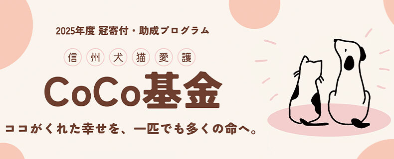 「信州犬猫愛護CoCo基金」は、長野県内において保護犬・保護猫の殺処分ゼロを目指し、動物たちの命と幸せを守る活動を支援するために設立された冠基金です。