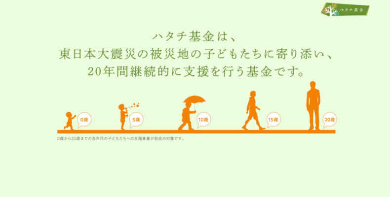 「東日本大震災発生時に、0歳だった赤ちゃんが無事にハタチを迎えるその日まで」というコンセプトの下、東日本大震災発生直後から20年間継続的に、被災地の子どもたちに寄り添い支援を行う基金です。