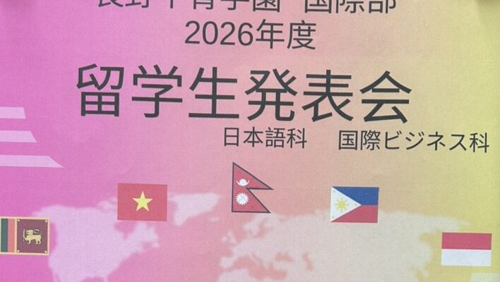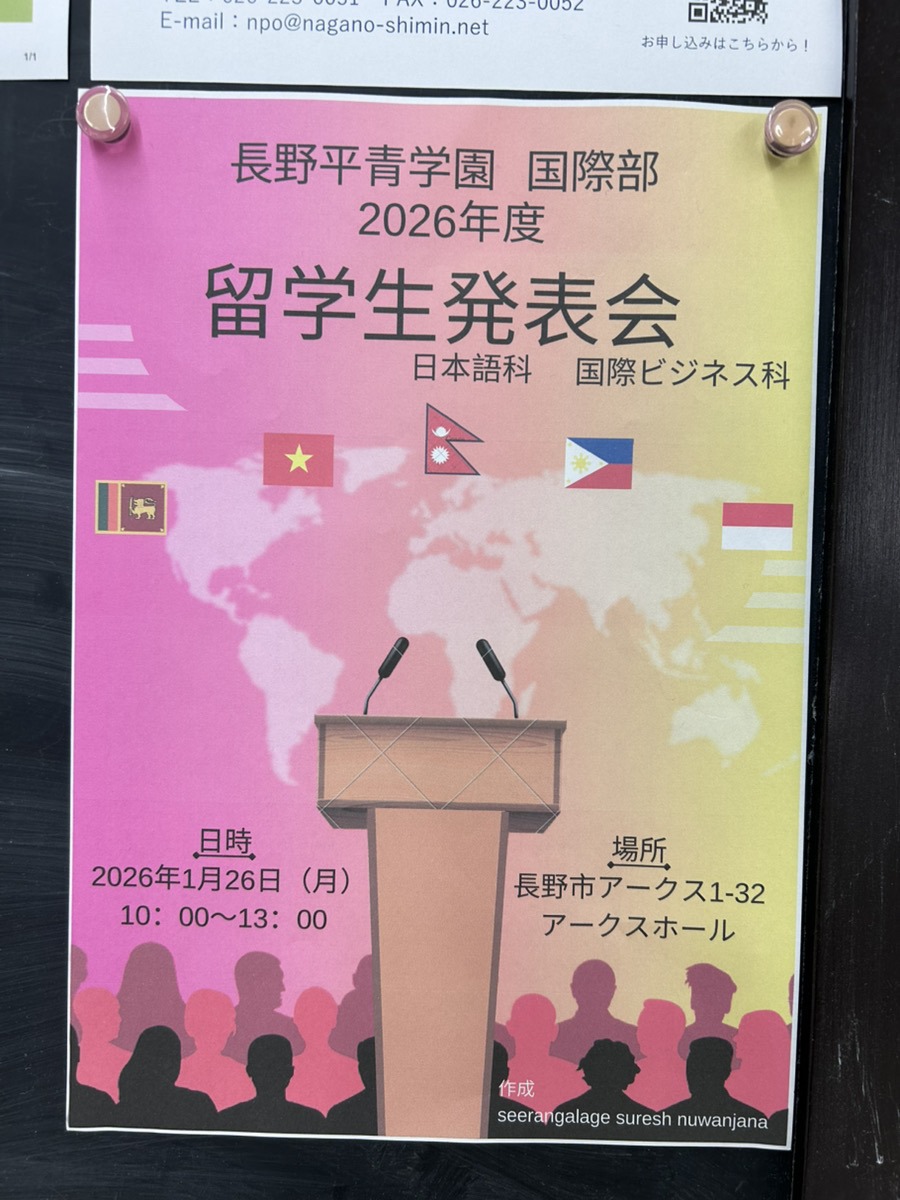 【長野平青学園国際部主催】2026年度留学生発表会 2026年1月18日カテゴリー: イベント・交流会 ネパール、フィリピンなどの5つの国の紹介を聞いたり、外国のお菓子を食べながら学生と国際交流しませんか??入退室は自由です! ◆日時:2026年1月26日(月)10:00~13:00◆会場:長野市アークス1-32 アークスホール ◆お問い合わせ 長野市国際交流コーナーTEL:026-223-0053 #情報 #NPO #長野市 #市民活動 #国際交流 #長野平青学園国際部 このページをシェアする クリックして友達にメールでリンクを送信 (新しいウィンドウで開きます) メールアドレス クリックして印刷 (新しいウィンドウで開きます) 印刷 Tweet こちらもあわせてチェック 前の記事【まんまるからお知らせ】2026年のカレンダーご自由にお持ちいただけます!!次の記事【長野県シニア大学本部 (公財)長野県長寿社会開発センター主催】長野県シニア大学2026学生募集!