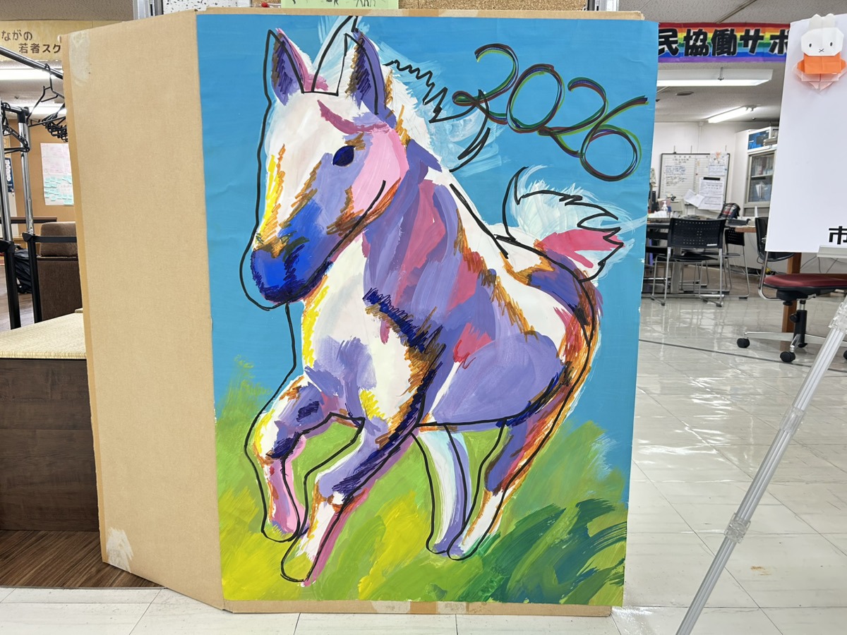 【まんまるの日常】センター入口の絵が変わりました!! 2026年1月19日カテゴリー: まんまるからのお知らせ 昨年、高校生に2025年の干支である蛇の絵を描いてもらったのですが、今年は馬の絵を描いてくれました!! 色使いが素敵で気持ちも前向きになります!!✨この馬のように、明るく2026年を駆け抜けて行きたい!! このページをシェアする クリックして友達にメールでリンクを送信 (新しいウィンドウで開きます) メールアドレス クリックして印刷 (新しいウィンドウで開きます) 印刷 Tweet こちらもあわせてチェック 前の記事【福祉教育推進フォーラムをゆるく考える会主催】福祉教育実践活動みほん市
