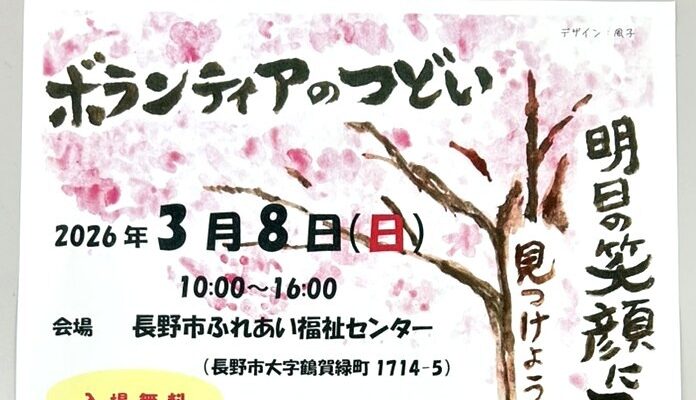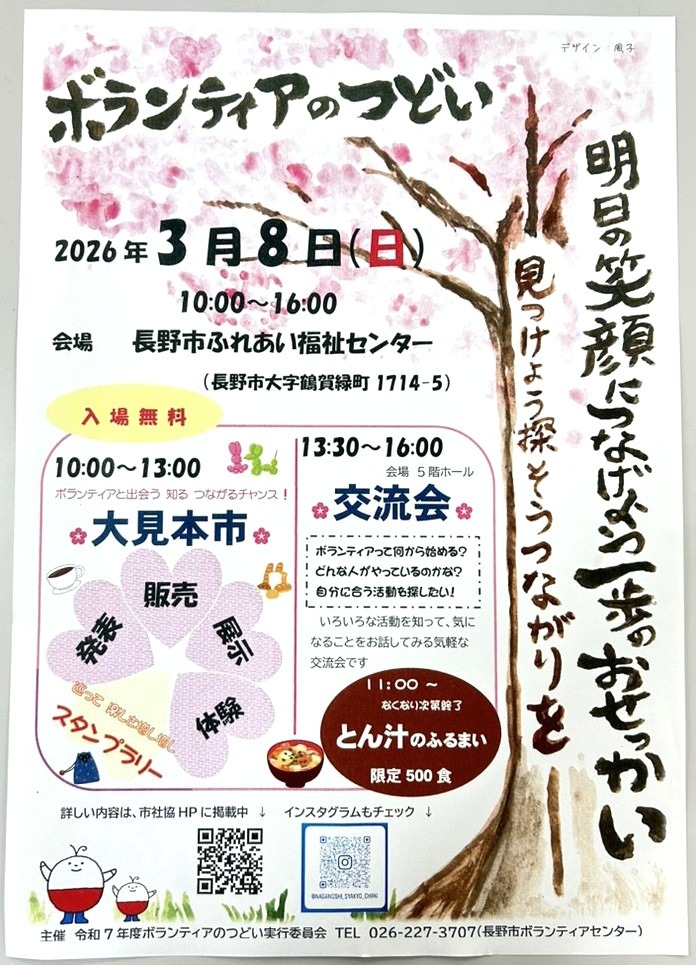 【令和7年度ボランティアのつどい実行委員会主催】ボランティアのつどい 2026年1月20日カテゴリー: イベント・交流会 ボランティアと出会う、知る、つながるチャンスです!限定500食のとん汁も! ◆日時:2026年3月8日(日)10:00~16:00◆会場:長野市ふれあい福祉センター◆参加費:無料 ◆お問い合わせ 長野市ボランティアセンターTEL:026-227-3707 #情報 #NPO #長野市 #市民活動 #ボランティア活動 #長野市ボランティアセンター このページをシェアする クリックして友達にメールでリンクを送信 (新しいウィンドウで開きます) メールアドレス クリックして印刷 (新しいウィンドウで開きます) 印刷 Tweet こちらもあわせてチェック 前の記事【まんまるの日常】センター入口の絵が変わりました!!