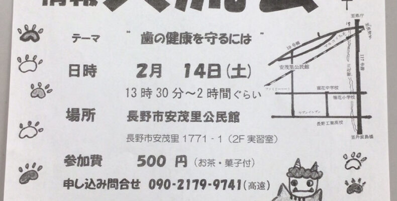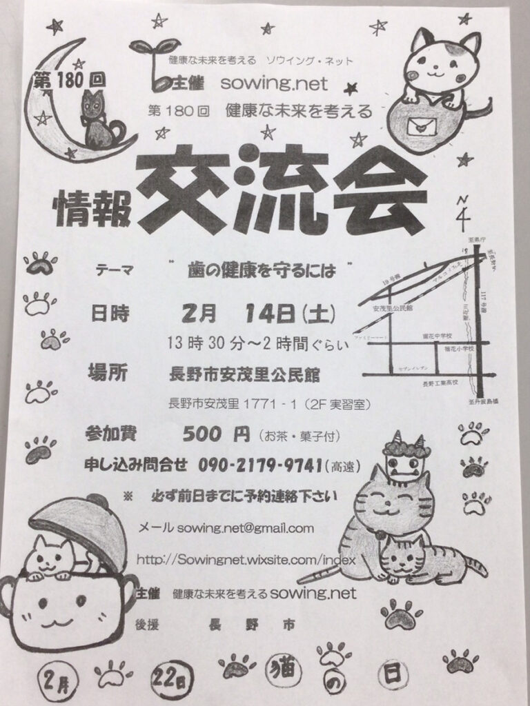 【健康な未来を考えるsowing.net主催】第180回健康な未来を考える情報交流会 2026年1月31日カテゴリー: 講座 今回のテーマは「歯の健康を守るには」です! ◆日時:2026年2月14日(土)13:30~2時間くらい◆会場:長野県安茂里公民館(長野県安茂里1771-1 2F実習室)◆参加費:500円(お茶・菓子付)◆申込締切:2月13日(金) ◆申し込み・お問い合わせ 健康な未来を考えるsowing.netTEL:090-2179-9741メール:sowing.net@gmail.com このページをシェアする クリックして友達にメールでリンクを送信 (新しいウィンドウで開きます) メールアドレス クリックして印刷 (新しいウィンドウで開きます) 印刷 Tweet こちらもあわせてチェック 前の記事【長野県、ソフトバンク株式会社主催】『自社DX×ゼロカーボン』セミナー
