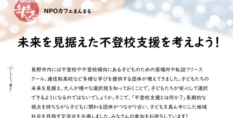 長野市内には不登校や不登校傾向にある子どものための居場所やフリースクール、通信制高校など多様な学びを…