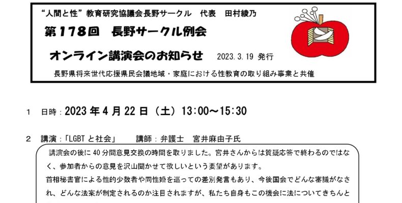 【イベント情報】第178回長野サークル例会 オンライン講演会のお知らせ 2023年4月12日カテゴリー: 講座 長野県内では、「パートナーシップ宣誓制度」導入が進んできました。そこで、”人間と性”教育研究協議会長… もっと見る